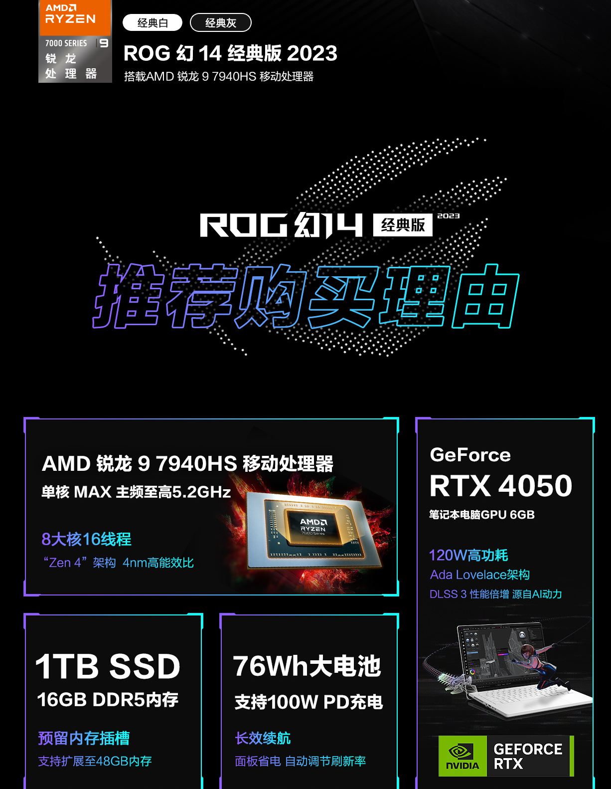 ROG玩家国度幻14Air2023星空版4060轻薄4090设计师高性能笔记本电脑 幻14Air白/R9-8945HS/RTX4050 16G 1T固态 2.5K 120Hz 星云屏/14英寸
